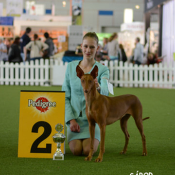Nach dem unplatzierten V vom Vortag, ging es in eine mit 10 Rüden wieder stark besetzte Jugendklasse. Gerichtet wurde heute vom Rassespezialisten Christophe Coppel aus Frankreich. Wer gedacht hat, Bitte Ahrens wäre gründlich gewesen, der hätte heute seine wahre Freude gehabt. Die Journalistin Karla Schwede schrieb so schön "Wie ein Scanner untersuchte er jeden Hund von der Nasenspitze bis zum letzten Haar an der Rute". Für mich ging ein Traum in Erfüllung, als er Stormy das V1 und das Jugend CAC zusprach. Glücklich und zufrieden verschwanden wir zurück an den Pharaohnen Ring. Einige Zeit später erschien die Besitzerin einer Whippet Hündin um mich an das Jugend BOB zu erinnern. Ich weckte Stormy aus dem Tiefschlaf und rannte zurück an in Ring, wo alle schon warteten. Im Vergleich zu der Hündin waren wir noch schlaftrunken und unvorbereitet, sodass das Jugend BOB verdient an die Hündin ging. Als hätte man es geahnt, wies mich der Sonderleiter darauf hin, dass ich mich trotzdem zum BOB bereithalten möge. Zum BOB erschienen wir wach und besser vorbereitet. Das BOB ging an eine wunderschöne Blue Spring's Hündin. Nun mussten Stormy und ich mit den anderen Rüden um das BOS laufen und völlig unerwartet gab Christophe Coppel das "Best of opposite Sex" an Stormy und mich.